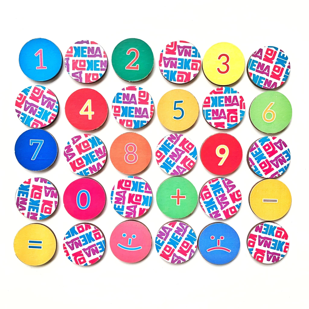 Dos series de 0 al 9, 2 signos de suma,2 signos de resta, dos signos igual, 2 caritas sonrientes y 2 caritas tristes.